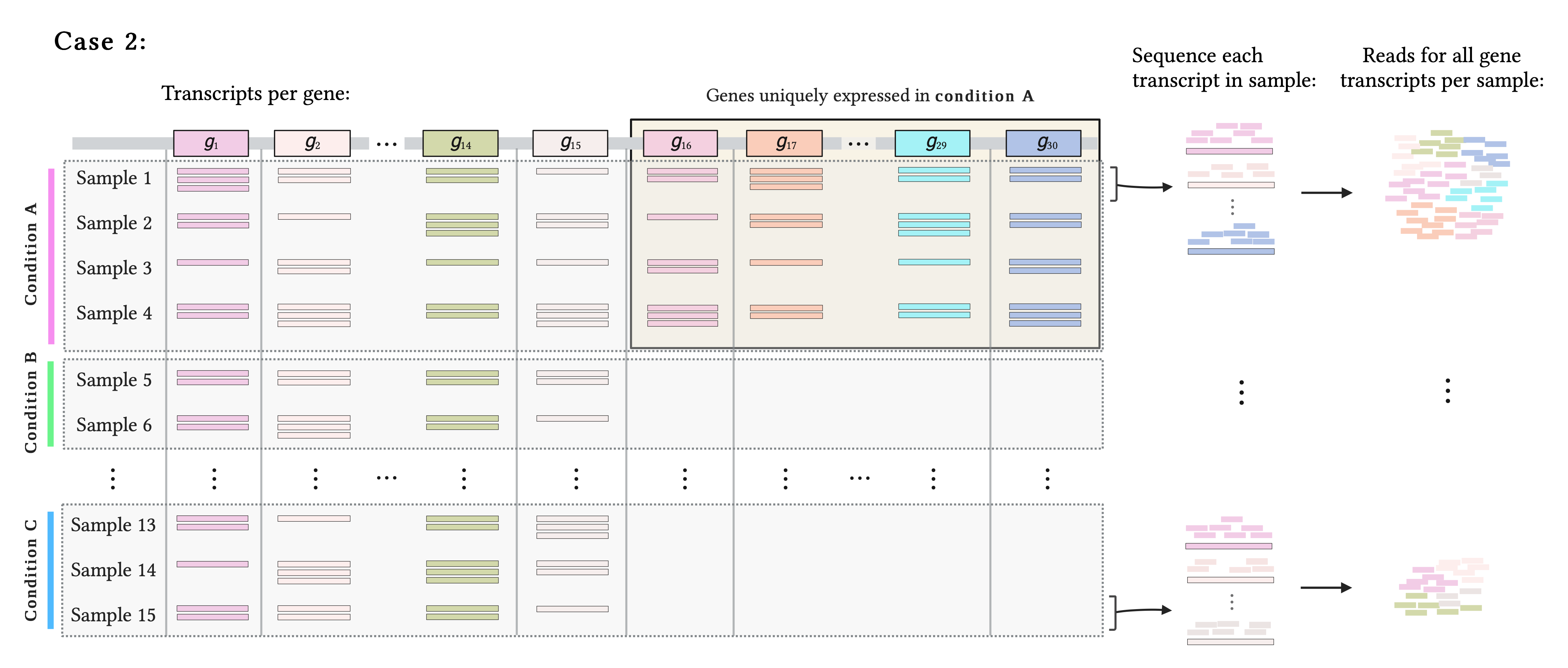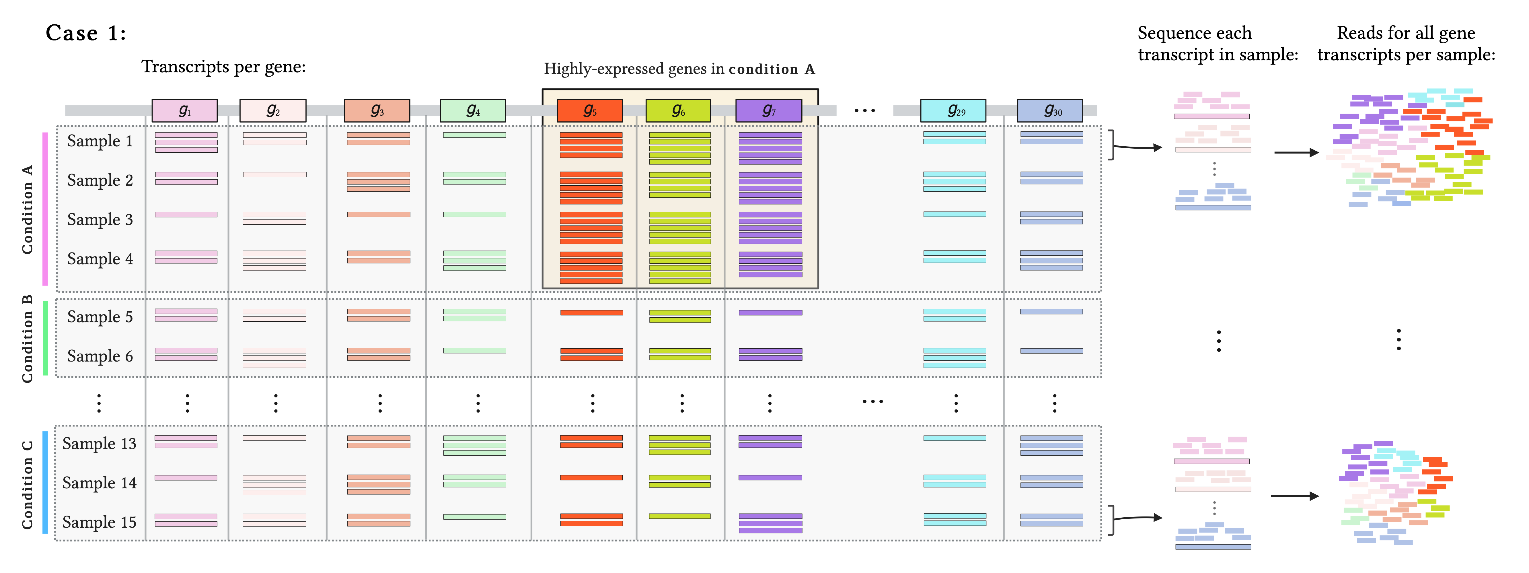 *The number of reads mapping to a given gene in a sample depends on gene expression (number of gene transcripts), sequencing depth (number of sequenced reads), and gene length: larger genes result in more mapping reads. Thus, read counts are not direct estimations of gene expression. In our examples, however, we are assuming all existing transcripts in a sample are captured and equally sequenced and genes have the same length, so read counts reflect expression.