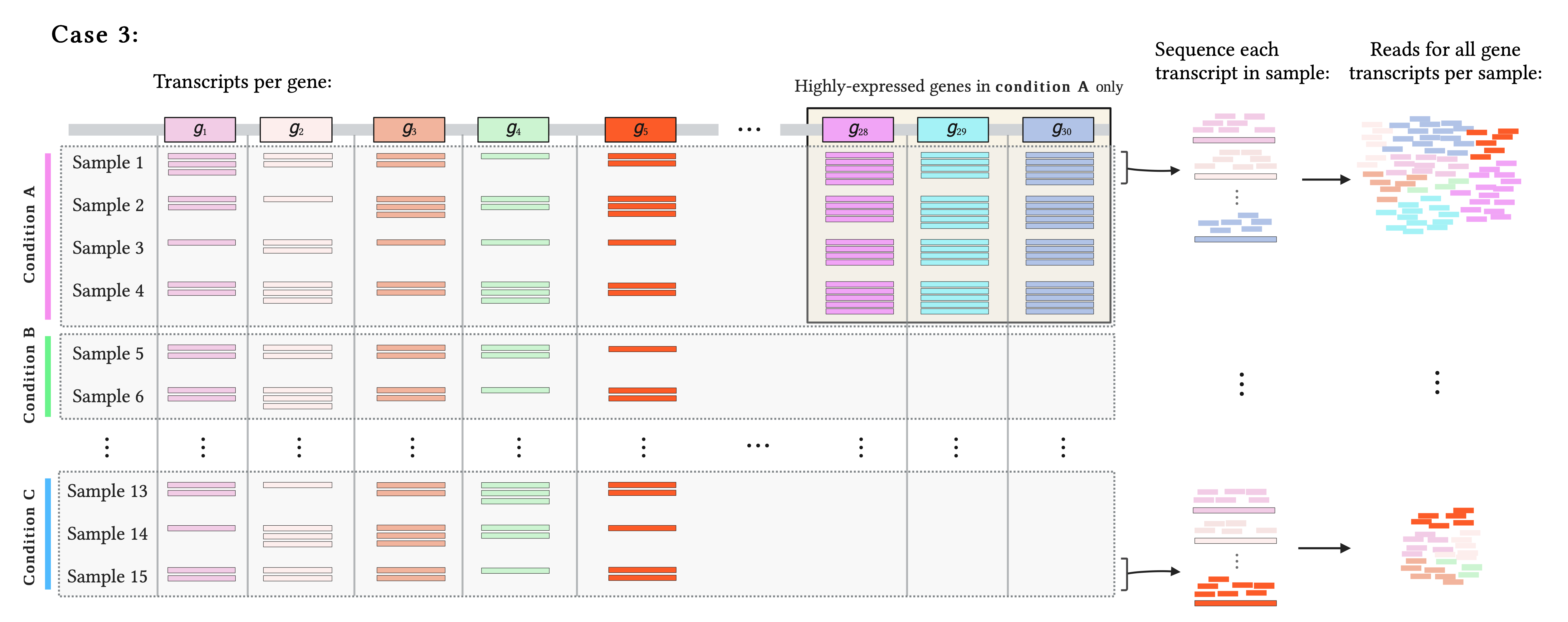 In the third scenario, of the 30 genes, 27 have similar expression levels in all 3 conditions, and 3 are uniquely expressed in condition A and are more highly-expressed than the rest of genes (genes 28, 29, and 30).