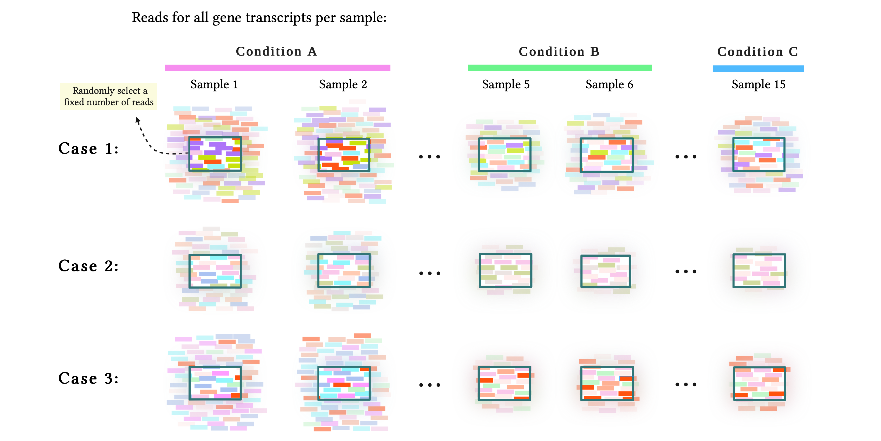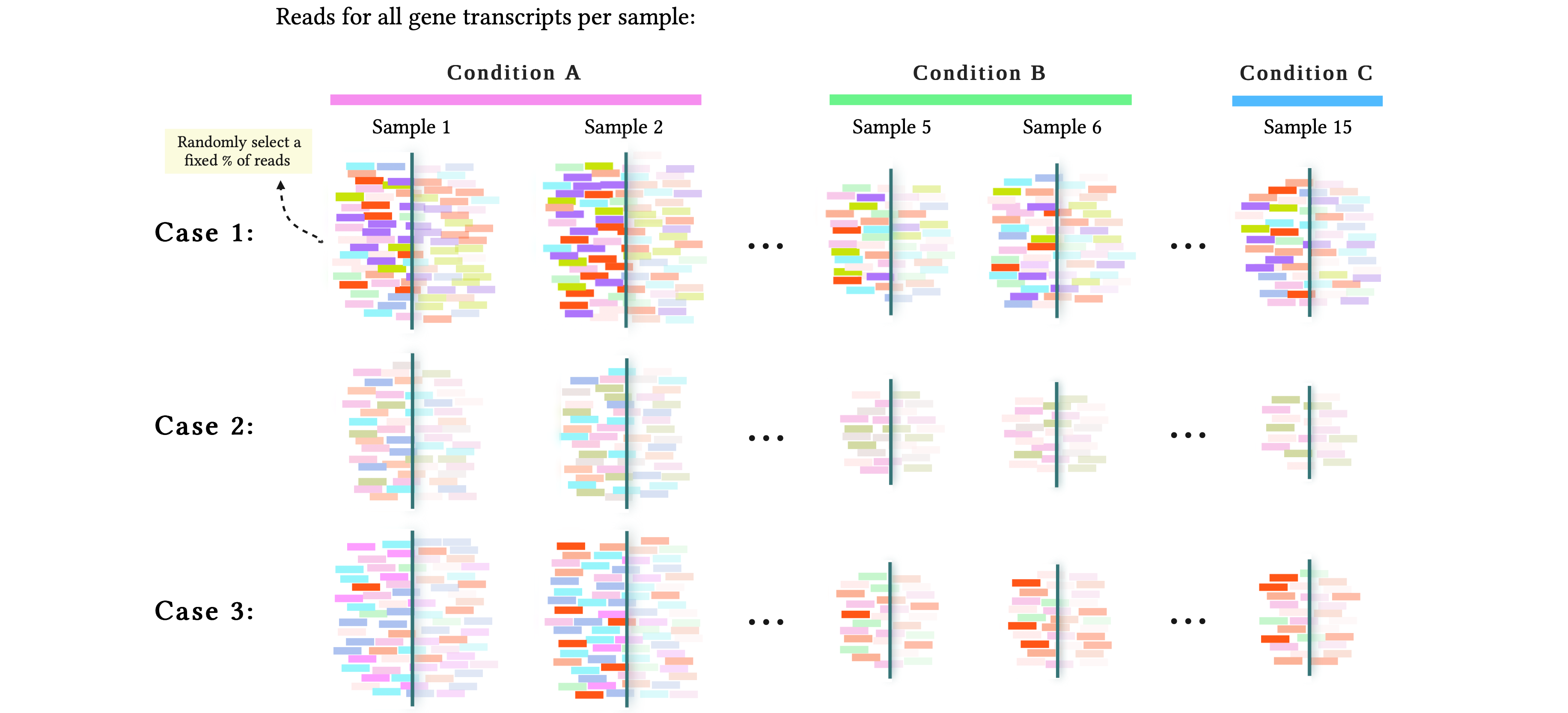 The sampling of molecules introduces a proportionality problem in the RNA-seq count data: in those samples with greater total expression, caused by a number of highly-expressed genes (Case 1), a greater number of expressed genes (Case 2), or both (Case 3), a greater proportion of reads will come from such genes, taking away reads for all the other genes and apparently reducing their expression. This is depicted in the previous figure: note how in condition A, in the first case more reads from the highly-expressed genes 5, 6, and 7 are selected; in the second case, reads from the genes 16, 17, …, 29, 30, expressed in condition A only, reduce the number of reads for the other genes, and in the third case most selected reads correspond to the condition A-only highly-expressed genes 28, 29, and 30.