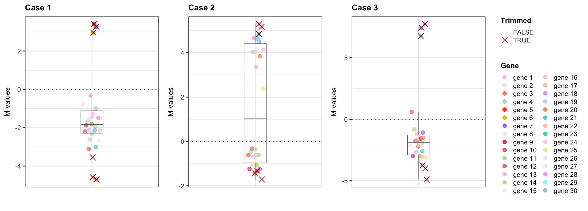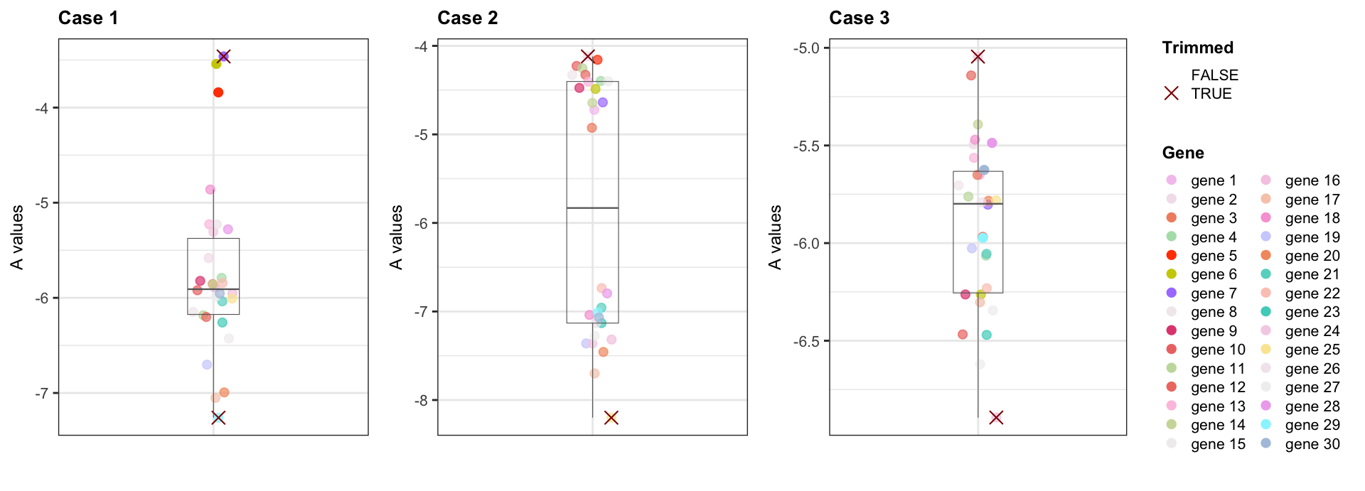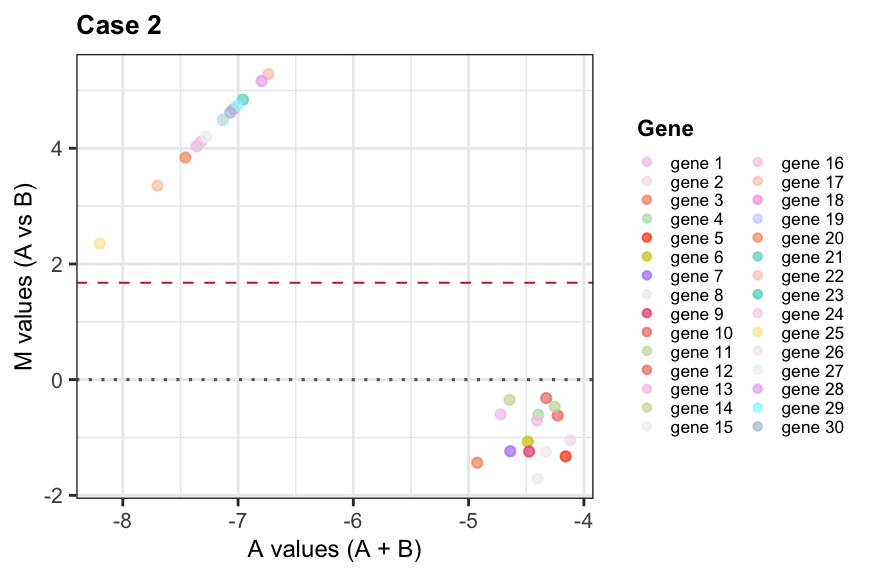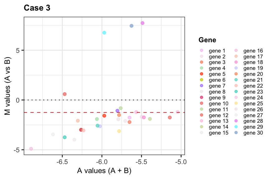 ## MA plotsfor(case in1:3){## Select sample 1 as k and 5 as r rna_seq_expr <-as.matrix(eval(parse_expr(paste0("rna_seq_expr_case", case)))) yg <- rna_seq_expr[, c(1,5)]colnames(yg) <-c("k", "r")## Replace 0s with 1 (smallest positive integer) yg[yg ==0] <-1## Library sizes Nk =colSums(yg)["k"] Nr =colSums(yg)["r"]## Compute M and A values M_values <-log2( (yg[,"k"] / Nk) / (yg[,"r"] / Nr) ) A_values <- (log2(yg[,"k"] / Nk) +log2(yg[,"r"] / Nr)) /2## Variance weight per gene (see step 3) vg <- ((Nk - yg[, "k"])/(Nk * yg[, "k"])) + ((Nr - yg[, "r"])/(Nr * yg[, "r"])) df <-data.frame("M"= M_values, "A"= A_values, "v"= vg,"gene"=names(M_values)) df$gene <-factor(df$gene, levels = df$gene)assign(paste0("df_case_", case), df)## M vs A plot plot <-ggplot(df, aes(x = A, y = M, color = gene, alpha = gene)) +geom_point() +theme_bw() +scale_color_manual(values = col_palette) +guides(colour =guide_legend(override.aes =list(size =1.2))) +scale_alpha_manual(name ="Gene", values =get(paste0("alphas_case_", case))) +geom_hline(yintercept =0, size =0.55, linetype =3, color ="gray40") +geom_hline(yintercept =mean(df$M), size =0.35, linetype =2, color ="firebrick3") +labs(title =paste("Case", case), x ="A values (A + B)", y ="M values (A vs B)", color ="Gene") +theme(plot.title =element_text(face ="bold", size =10), axis.text.x =element_text(size =8), axis.text.y =element_text(size =8), axis.title.x =element_text(size =9), axis.title.y =element_text(size =9), legend.title =element_text(face ="bold", size =8.5), legend.text =element_text(size =6.5), legend.key.width =unit(0.25, "cm"),legend.key.height =unit(0.25, "cm"))print(plot)}