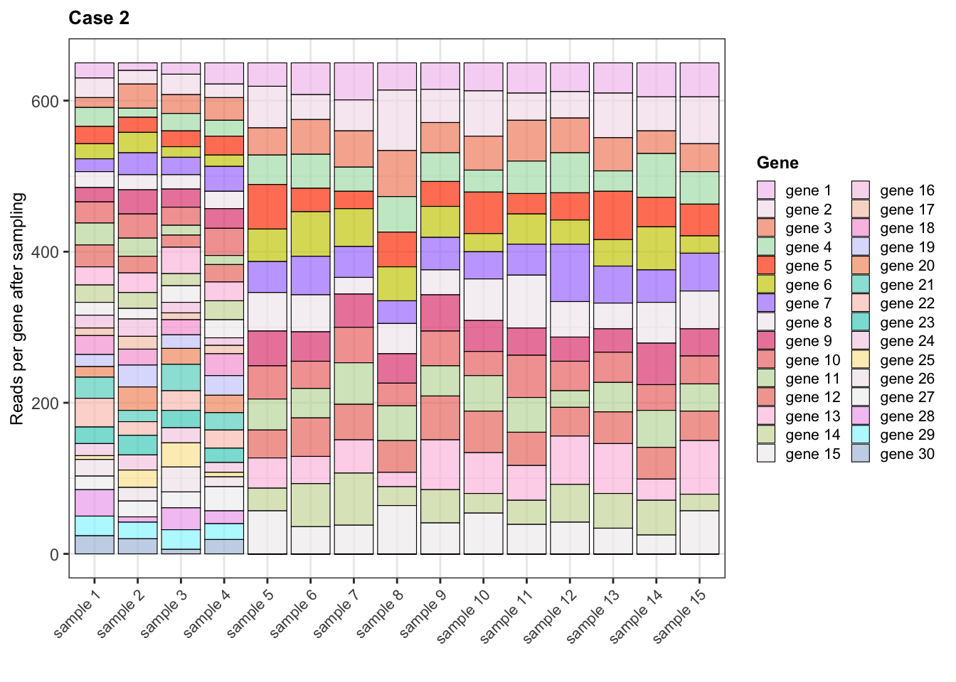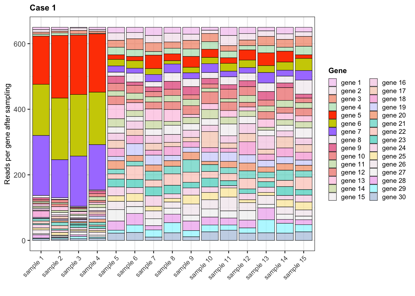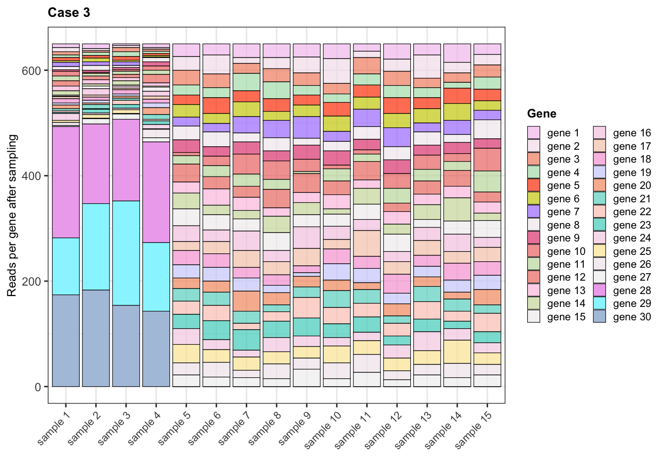 library(rlang)library(reshape2)library(Polychrome)for(case in1:3){ expr <-eval(parse_expr(paste0("expr_case", case)))## Create pool of reads per gene in each samplecolnames(expr) <- library_sizes$sample reads_per_gene_per_sample <-apply(expr, 2, function(sample) {rep(rownames(expr), sample)})## Randomly select 650 reads per sampleset.seed(12242024) reads_sample <-lapply(reads_per_gene_per_sample, function(sample_reads) {sample(sample_reads, size =650, replace =FALSE)})## Read counts per gene after sampling rna_seq_expr <-lapply(reads_sample, function(sample){table(sample)[rownames(expr)]}) rna_seq_expr <-as.data.frame(do.call(cbind, rna_seq_expr))rownames(rna_seq_expr) <-rownames(expr)## Gene with NA = 0 reads rna_seq_expr[is.na(rna_seq_expr)] <-0assign(paste0("rna_seq_expr_case", case), rna_seq_expr) rna_seq_expr$gene <-rownames(rna_seq_expr) rna_seq_expr_melted <-melt(rna_seq_expr)colnames(rna_seq_expr_melted) <-c("gene", "sample", "count")## Order genes for plotting rna_seq_expr_melted$gene <-factor(rna_seq_expr_melted$gene, levels =paste("gene", 1:30))## Color palette for genesset.seed(12212024) col_palette <-sample(c(hcl.colors(30, palette ="Pastel 1"), hcl.colors(30, palette ="PinkYl"),hcl.colors(30, palette ="Cyan-Magenta")), 30, replace = F)names(col_palette) <-rownames(expr) col_palette[paste("gene", c(5:7, 28:30))] <-c("orangered", "yellow3", "mediumpurple1", "plum2", "cadetblue1", "lightsteelblue")if(case ==1){ alphas <-rep(c(0.7, 1, 0.7), c(4, 3, 23)) }elseif(case ==2){ alphas <-rep(0.7, 30) }else{ alphas <-rep(c(0.7, 1), c(27, 3)) }assign(paste0("alphas_case_", case), alphas)## Bar plot plot <-ggplot(data = rna_seq_expr_melted, aes(x = sample, y = count, fill = gene, alpha = gene)) +geom_bar(stat ="identity", colour ="black", linewidth =0.2) +theme_bw() +labs(title =paste("Case", case), x ="", y ="Reads per gene after sampling", fill ="Gene") +scale_fill_manual(values = col_palette) +scale_alpha_manual(name ="Gene", values = alphas) +theme(plot.title =element_text(face ="bold", size =10), axis.text.x =element_text(size =8, angle =45, hjust =1), axis.title.y =element_text(size =9), legend.title =element_text(face ="bold", size =9), legend.text =element_text(size =8), legend.key.width =unit(0.35, "cm"),legend.key.height =unit(0.35, "cm"))print(plot)}