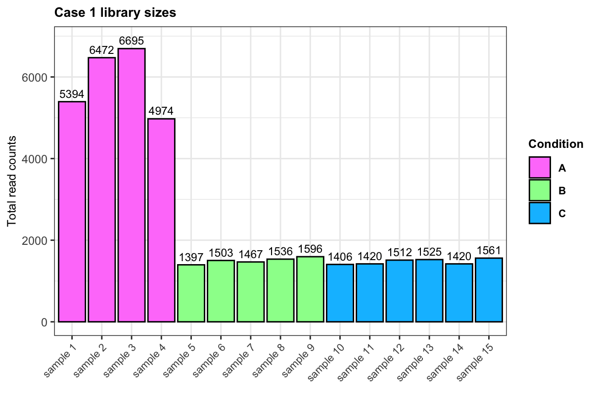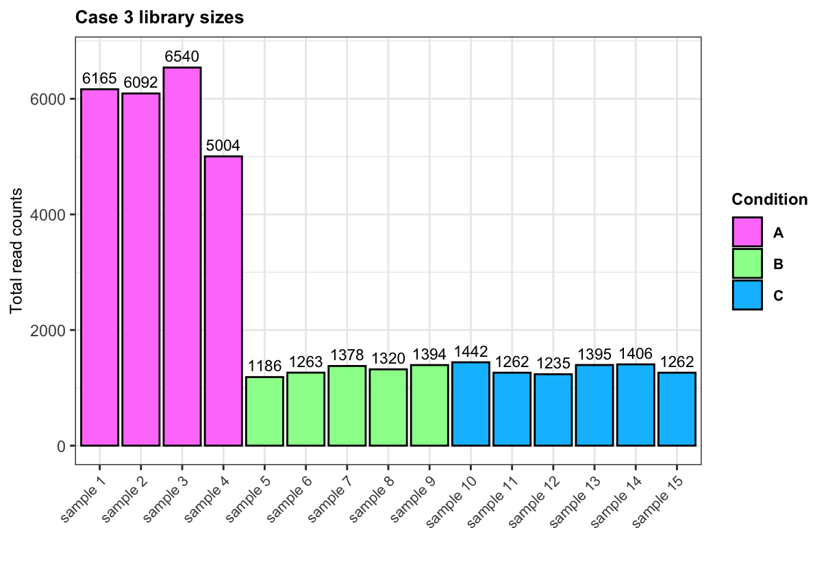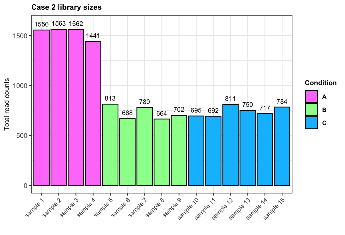 library(ggplot2)## Sample library sizes and conditionslibrary_sizes <-data.frame("lib_size_case1"=apply(expr_case1, 2, sum),"lib_size_case2"=apply(expr_case2, 2, sum),"lib_size_case3"=apply(expr_case3, 2, sum),"sample"=paste("sample", 1:15),"Condition"= conditions)## Order samples for plottinglibrary_sizes$sample <-factor(library_sizes$sample, levels =unique(library_sizes$sample))## Bar plot for library sizes in each case for(case in1:3){## args for adding numbers ynum <-ifelse(case ==2, 60, 200) plot <-ggplot(data = library_sizes, aes(x = sample, y = .data[[paste0("lib_size_case", case)]], fill = Condition)) +geom_bar(stat ="identity", colour ="black") +geom_text(aes(y = .data[[paste0("lib_size_case", case)]] + ynum, label = .data[[paste0("lib_size_case", case)]]), size =3) +theme_bw() +labs(title =paste("Case", case, "library sizes"), x ="", y ="Total read counts") +scale_fill_manual(values =c("A"="orchid1", "B"="palegreen1", "C"="deepskyblue1")) +theme(plot.title =element_text(face ="bold", size =10), axis.title.y =element_text(size =9), axis.text.x =element_text(size =8, angle =45, hjust =1), legend.title =element_text(face ="bold", size =9), legend.text =element_text(face ="bold", size =8))print(plot)}