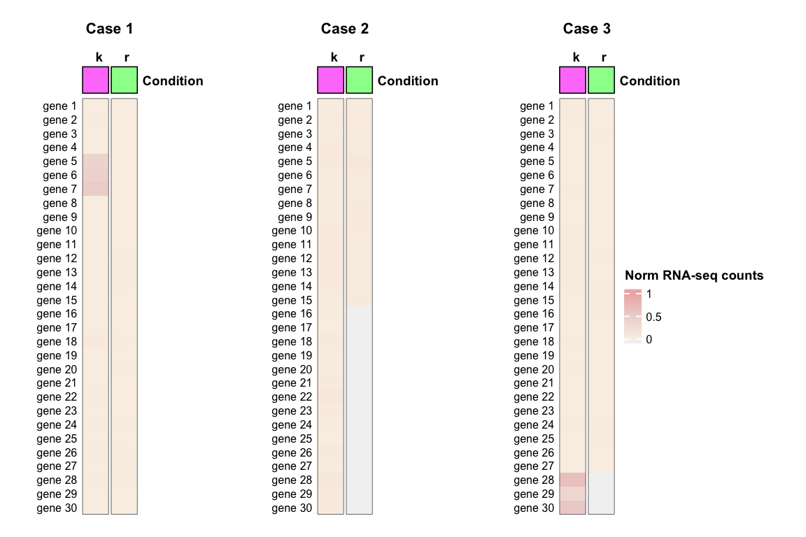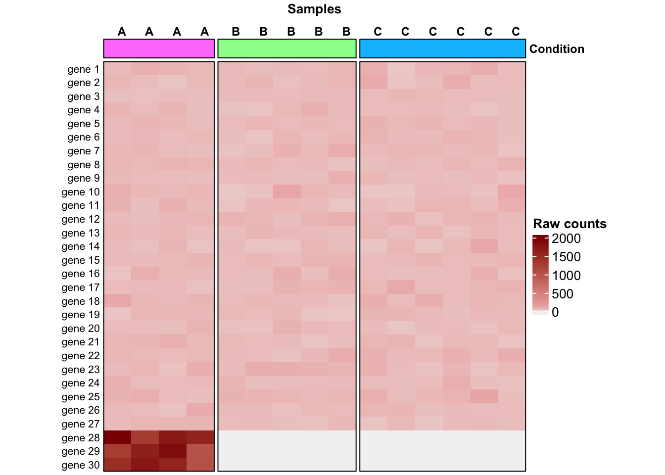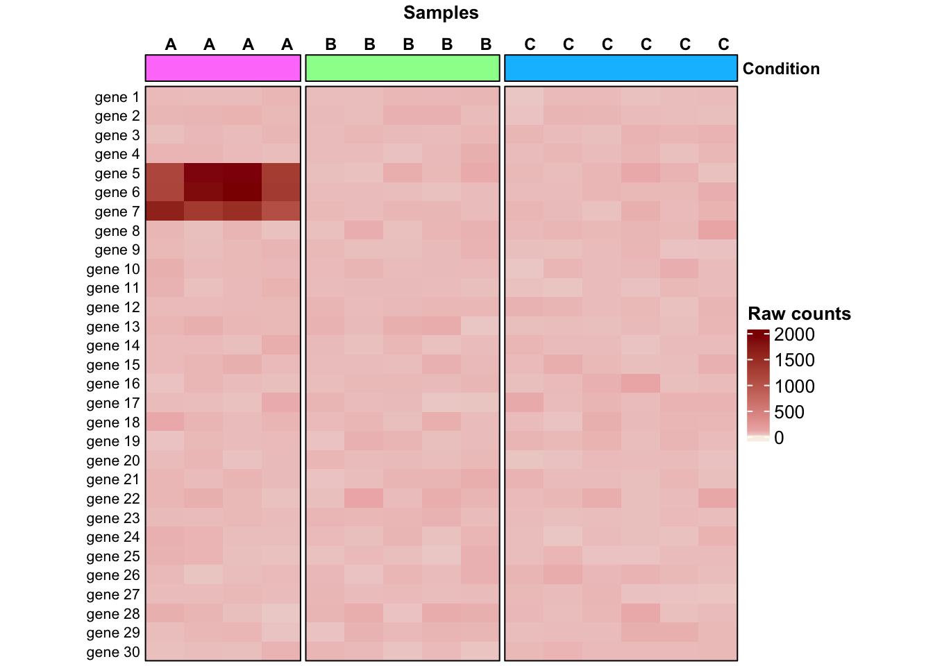 library(ComplexHeatmap)library(circlize)## 15 samples across 3 conditions conditions <-rep(c("A", "B", "C"), c(4, 5, 6))################################################################## Case 1:################################################################## Raw counts for 30 genes across the 15 samples as:## random numbers following a NB with mean = mu and var = mu + (mu^2/size)set.seed(12242024)expr_case1 <-matrix(data =rnbinom(450, mu=50, size=20), nrow =30)colnames(expr_case1) <- conditionsrownames(expr_case1) <-paste("gene", 1:30)## Introduce the 3 highly-expressed genes in condition A expr_case1[c("gene 5", "gene 6", "gene 7"), 1:4] <-sample(c(1000:2000), replace = T, size =12)## Heat mapcol_anno <-HeatmapAnnotation(Condition =anno_block(gp =gpar(fill =c("orchid1", "palegreen1", "deepskyblue1"), col ="black"), show_name = T), annotation_name_gp =gpar(fontsize =9, fontface ="bold"))Heatmap(expr_case1,name ="Raw counts", top_annotation = col_anno, col =colorRamp2(c(1, 10, 100, 2000), c("linen", "mistyrose2", "rosybrown2", "darkred")),cluster_rows =FALSE,cluster_columns =FALSE,column_split = conditions,column_title ="Samples",column_title_gp =gpar(fontsize =10, fontface ="bold"),column_names_side ="top",column_names_gp =gpar(fontsize =9, fontface ="bold"),column_names_rot =0,show_row_names =TRUE,row_names_gp =gpar(fontsize =8),row_names_side ="left",border =TRUE,heatmap_width =unit(12.5, "cm"),heatmap_height =unit(12.5, "cm"))