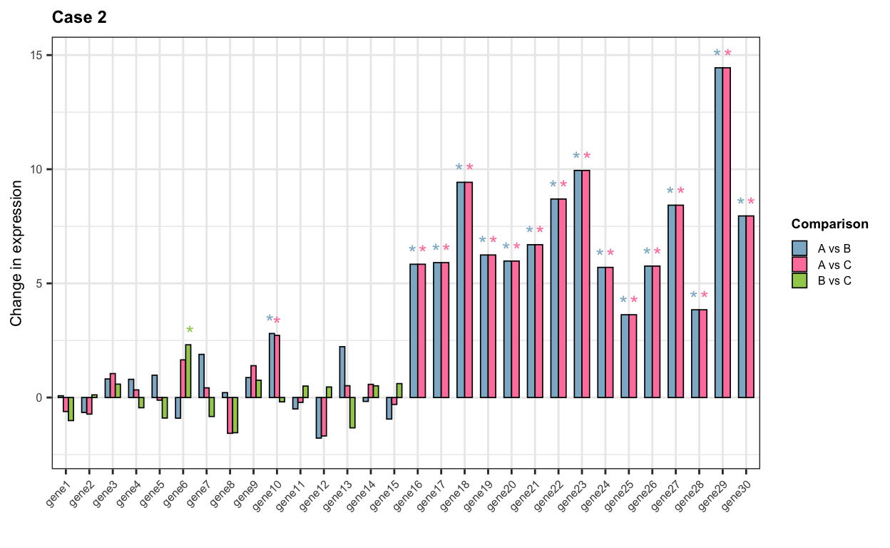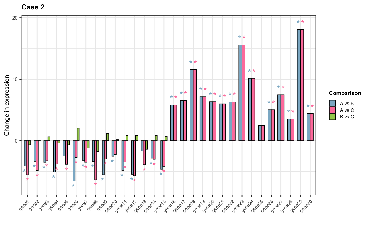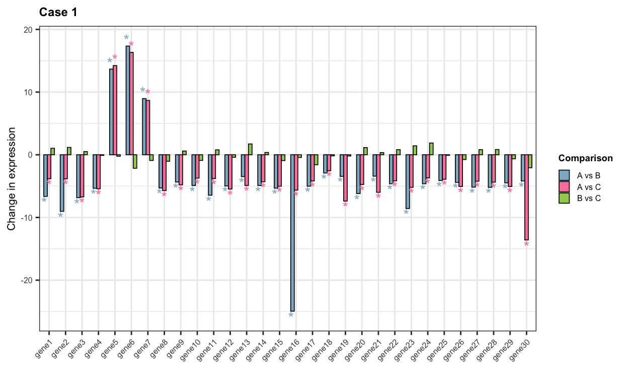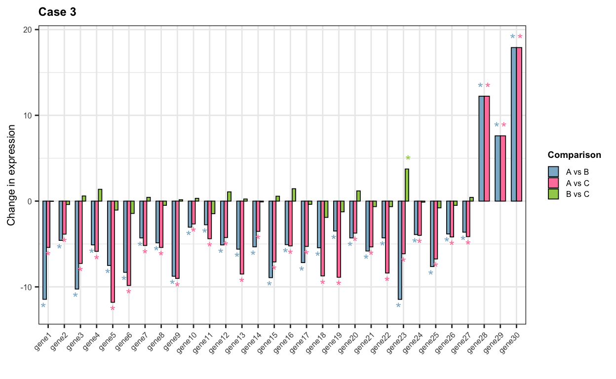 ## t-test per gene based on counts before and after sampling t_test_expr <-function(expr_counts){for(case in1:3){## Count matrix expr <-eval(parse_expr(paste0(expr_counts, "_case", case))) expr <-as.matrix(expr)colnames(expr) <- conditions## Create matrices to save gene p-values and t-stats pvals <-matrix(data =NA, nrow =30, ncol =3) tstats <-matrix(data =NA, nrow =30, ncol =3)colnames(pvals) <-colnames(tstats) <-c("A_vs_B", "A_vs_C", "B_vs_C")rownames(pvals) <-rownames(tstats) <-paste0("gene", 1:30)## Iterate over genesfor(i in1:nrow(expr)){## t-test for gene expr in condition1 vs condition2 condition_pairs <-list(c("A", "B"), c("A", "C"), c("B", "C"))if((case ==2& i>15) | (case ==3& i>27)){ condition_pairs <-list(c("A", "B"), c("A", "C")) }for(condition_pair in condition_pairs){ comparison <-paste0(condition_pair[1], "_vs_", condition_pair[2]) gene <-paste0("gene", i) gene_expr <- expr[i, colnames(expr) %in% condition_pair] formula <- gene_expr ~ Condition results <-t.test(formula = formula, data =data.frame("Condition"= conditions[conditions %in% condition_pair])) pvals[gene, comparison] <- results$p.value tstats[gene, comparison] <- results$statistic } }## Plot t-stats (expression change size) melted_pvals =na.omit(melt(pvals)) melted_tstats =na.omit(melt(tstats)) data =cbind(melted_pvals, melted_tstats$value)colnames(data) <-c("gene", "comparison", "p", "t") data$signif <-sapply(data$p, function(p){ if(p<0.05){"*"} else{NA}}) text_pos <-ifelse(expr_counts =="expr", 0.5, 1) plot <-ggplot(data, aes(x = gene, y = t, fill = comparison, color = comparison)) +geom_bar(stat ="identity", position="dodge", colour ="black", width =0.65, linewidth =0.3) +geom_text(aes(x = gene, y = t + ((sign(t))*text_pos), label = signif, group = comparison, color = comparison), position =position_dodge(0.9), hjust =0.5,show.legend = F) +theme_bw() +labs(title =paste("Case", case), x ="", y ="Change in expression", fill ="Comparison") +scale_fill_manual(values =c("A_vs_B"="#8DB6CD", "A_vs_C"="#FF82AB", "B_vs_C"="#A2CD5A"), labels =c("A vs B", "A vs C", "B vs C")) +scale_color_manual(values =c("A_vs_B"="#8DB6CD","A_vs_C"="#FF82AB","B_vs_C"="#A2CD5A")) +theme(plot.title =element_text(face ="bold", size =9), axis.text.x =element_text(size =6, angle =45, hjust =1), axis.title.y =element_text(size =8), axis.text.y =element_text(size =6), legend.title =element_text(face ="bold", size =7), legend.text =element_text(size =6), legend.key.width =unit(0.3, "cm"),legend.key.height =unit(0.3, "cm"))print(plot) }}